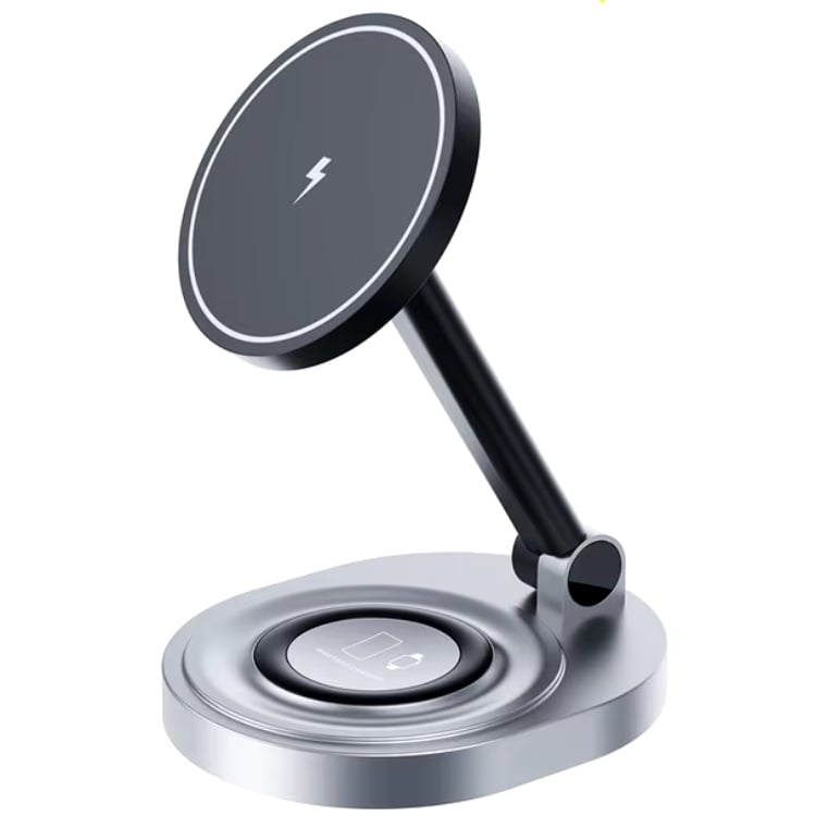 — удобная док‑станция с функцией **беспроводной зарядки Dual Port**, предназначенная для одновременной подзарядки двух совместимых устройств — например, смартфона и наушников — без использования проводов.